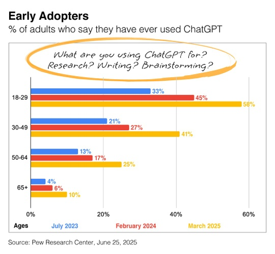 This Pew Research Center chart shows that 18-29 have embraced ChatGPT (an AI chatbot) faster than any other age group. No surprise. But what caught our attention was the 65+ numbers!